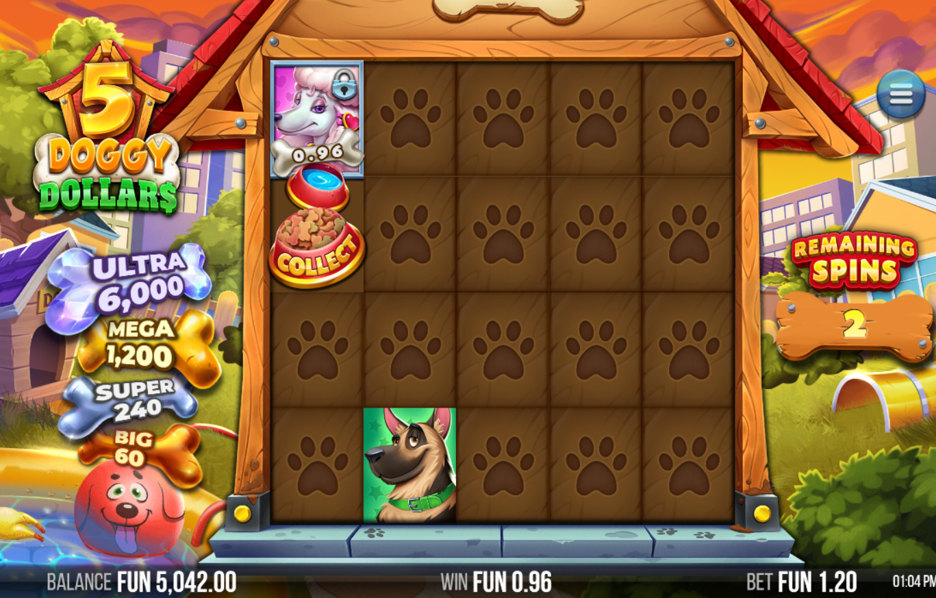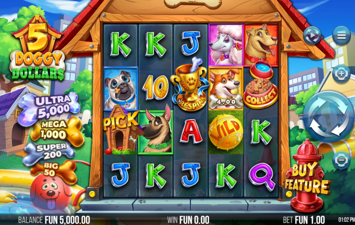 5 Doggy Dollars פופולרי בקרב שחקנים הודות לעיצוב המקסים בנושא כלבים, תכונות המשחק המרתקות והפוטנציאל לתגמולים מרגשים.