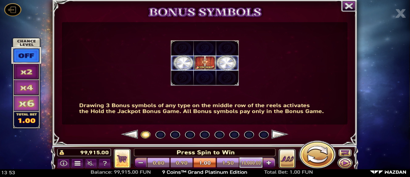 גלה את הערך של כל סמל על ידי הפניה לטבלת התשלום בתוך משבצת 9 Coins™ Grand Platinum Edition. משבצת זו אינה כוללת סמלים רגילים במשחק הבסיס, אלא מציגה סמלי בונוס כגון Cash Infinity™, Cash Out וסמלים מסתוריים.