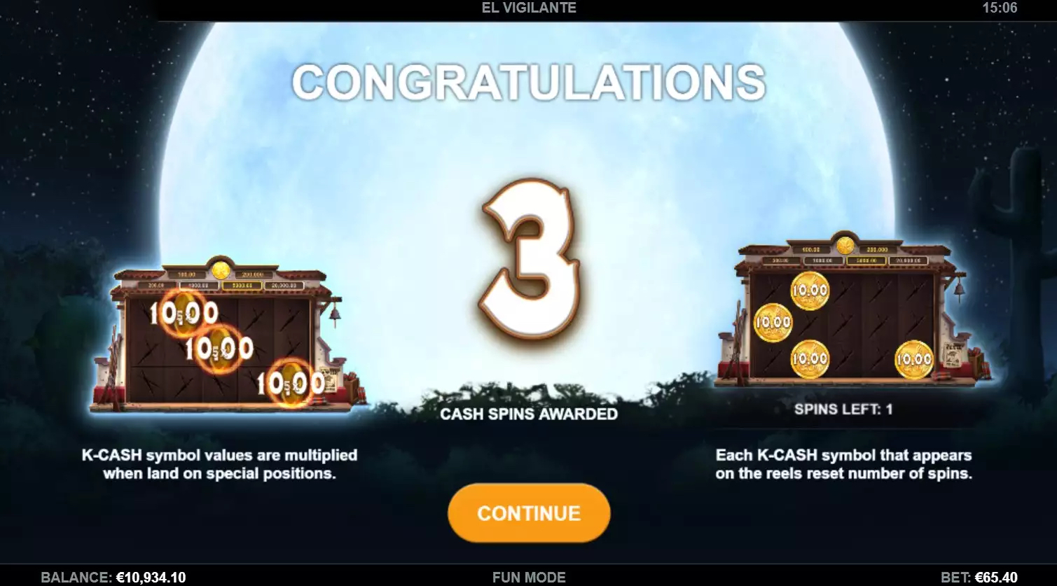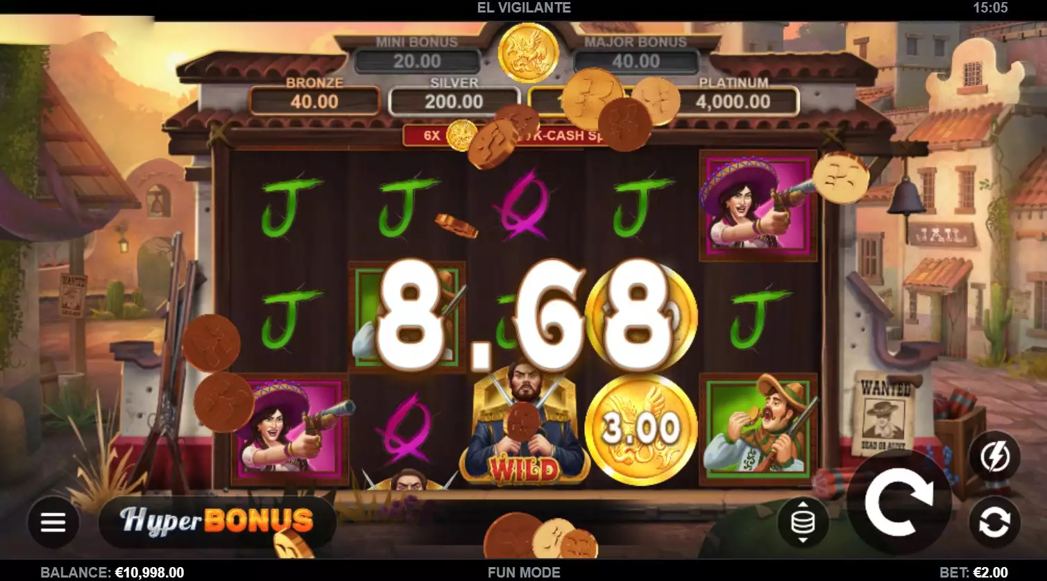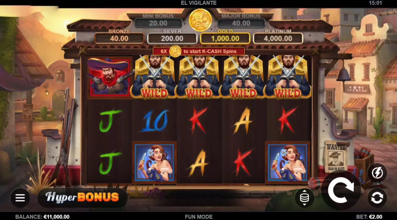 לבסוף, הגענו לחלק הטוב והמרגש ביותר - בונוסים וספינים חינם! זה לא סוד לאף אחד שכולנו אוהבים בונוסים מכיוון שכולנו אוהבים לקבל תגמול על הסבלנות, האסטרטגיות והזמן שלנו על משחק מסוים. ובכן, כשאתה משחק בחריץ El Vigilante אתה צריך לשים לב לדברים ספציפיים כדי ליהנות מהבונוסים והספינים החינמיים הבאים. קודם כל, כפי שהזכרנו למעלה במאמר, אם אתה אוסף 6 או יותר סמלי K-Cash אתה מפעיל 3 ספינים של K-Cash ואם אתה מכה 3 או יותר סמלי בונוס, אתה מפעיל 8 ספינים חינם במשחק הבסיס! ישנן אפשרויות רבות עבורך לזכות – פרסים מזומנים צמודים לסמלים של K-Cash Spins, 4 רמות של Cashpots או שני סוגים של בונוס! זכור שניתן להכפיל את פרסי ה-Cash ו-Cashpot במכפילים דביקים הנראים על הסלילים. הדקו את חגורות הבטיחות כי אנחנו אומרים לכם שהחריץ הזה גם מספק לכם היפרבונוס! פנה ישר לעניין ושחק ספינים חינם או K-Cash Spins מיד. אומרים שזו תכונה קלאסית של מפתח התוכנה בשם Kalamba Games.